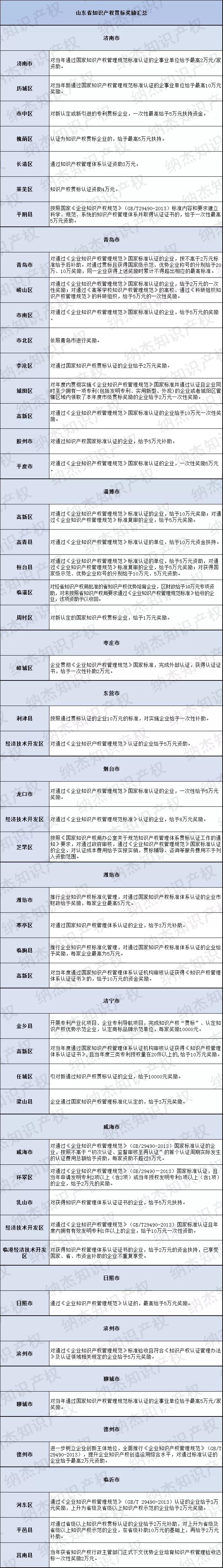 6、补贴,针对通过知识产权管理体系认证的企业,济南奖励2~10万,青岛奖励2~20万,淄博奖励5~10万,枣庄奖励2万,东营奖励5~10万,烟台奖励5~8万,潍坊奖励5~10万、济宁奖励3~10万,威海奖励2~10万,日照奖励5万,滨州奖励5万,聊城奖励5万,德州奖励2万,临沂奖励2~10万。
