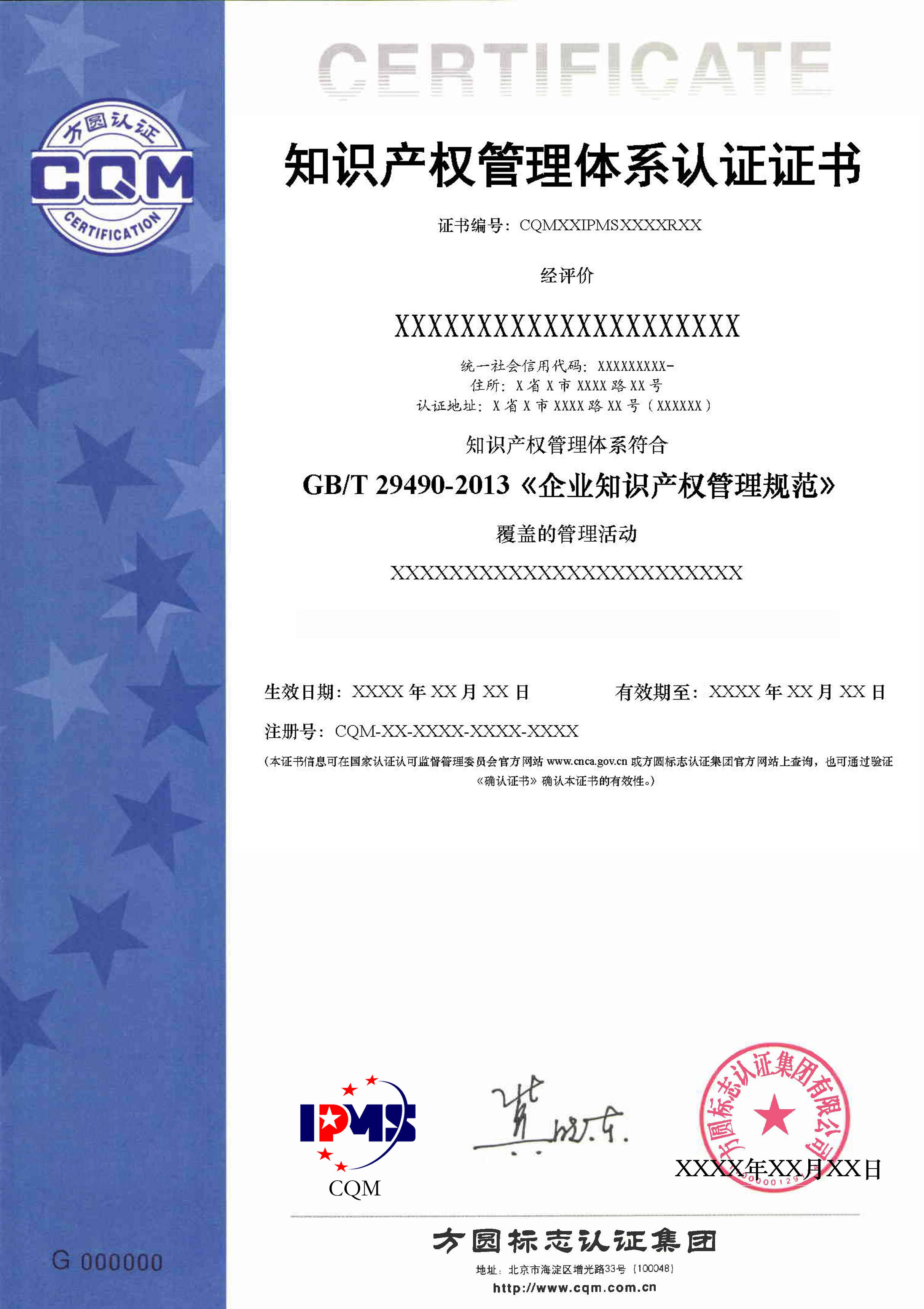 知识产权贯标咨询代理机构很多,但是认证审核机构却很少,全国知识产权贯标认证机构仅有13家。附方圆(CQM)证书样例: